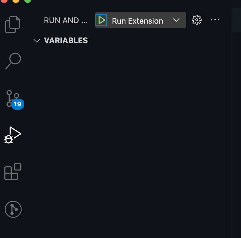 왼쪽에 있는 Run and Debug 메뉴를 클릭해서 상단에 플레이 버튼을 누르면 익스텐션이 실행되는데
